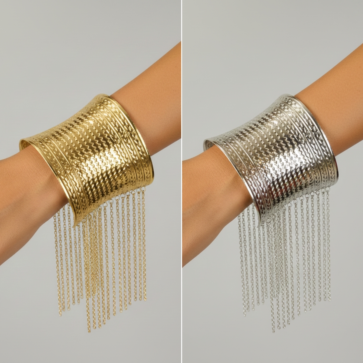 Bracelete Dayoff disponivel na cor Dourado e Prata com detalhes de ondulações e correntes penduradas Acessório para Dança do Ventre.