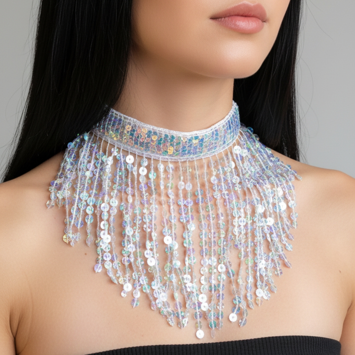 A gargantilha é composta por franjas longas repletas de paetês que criam um brilho intenso e um balanço encantador a cada movimento. Os fios delicados proporcionam fluidez e leveza, destacando o pescoço e valorizando qualquer figurino.