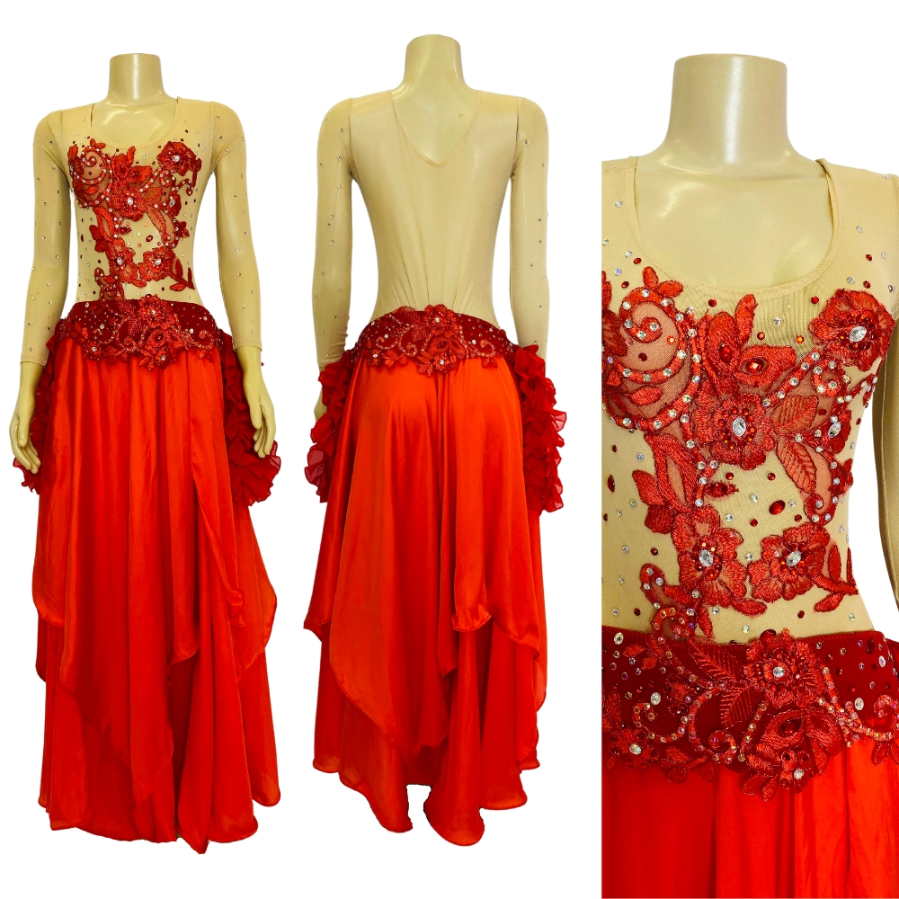 Traje Completo Body, Cinto e Saia, pronto para dançar. Cor dos ítens: Body nude com bordado vermelho e pontos de luz, cinturão vermelho com renda e saia vermelho claro.