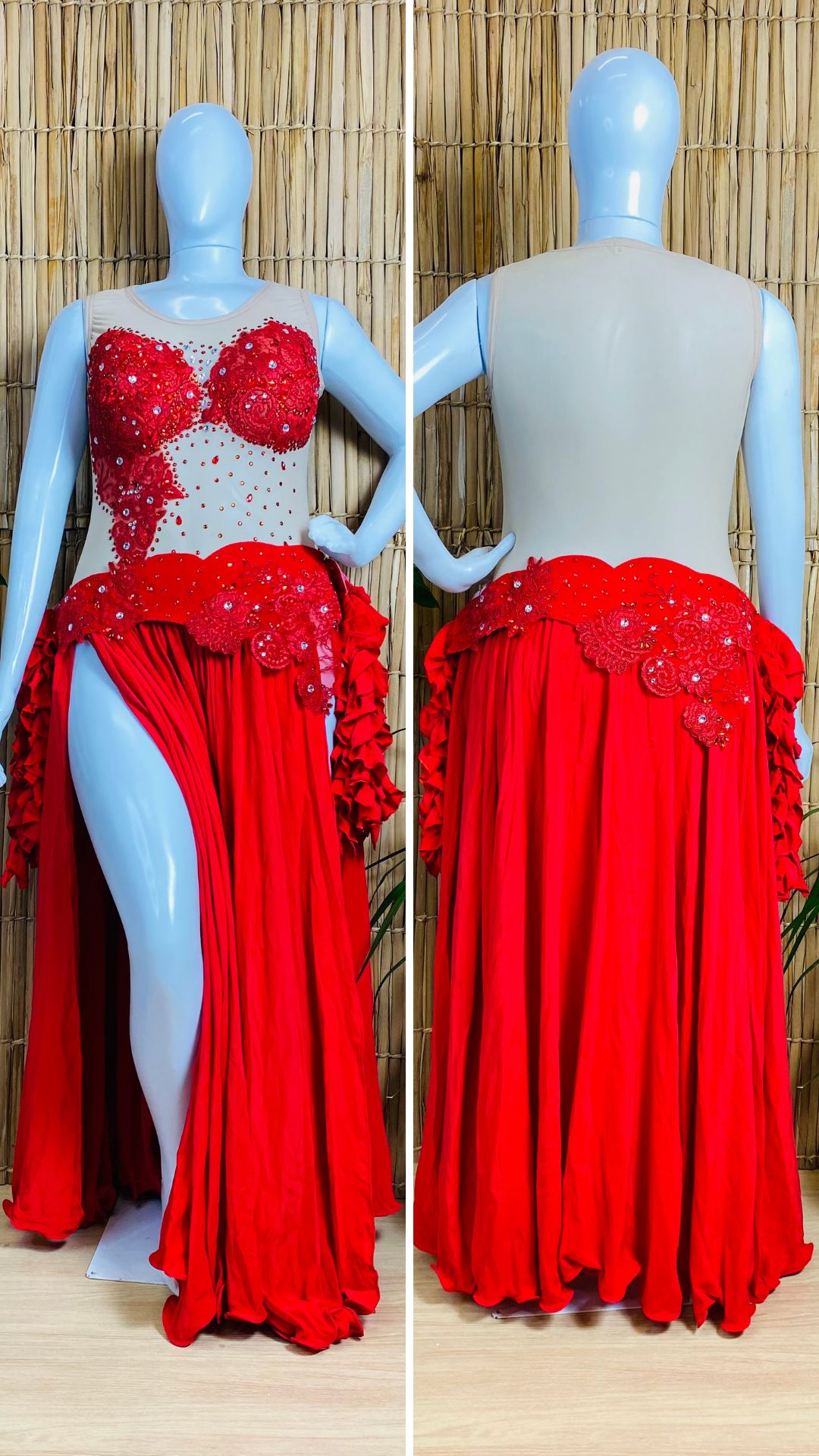 Traje Completo Body, Cinto e Saia, pronto para dançar. Cor dos ítens: Body Nude com bordado vermelho e pontos de luz, cinturão vermelho com renda e saia vermelha.