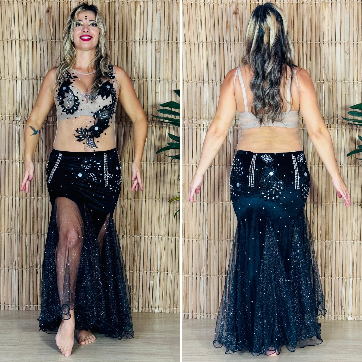 Traje Completo Body, saia midi, pronto para dançar. Cor dos ítens: Body nude (segunda pele) bordado com renda, saia sereia preta com bordado de renda, chatons e franja.