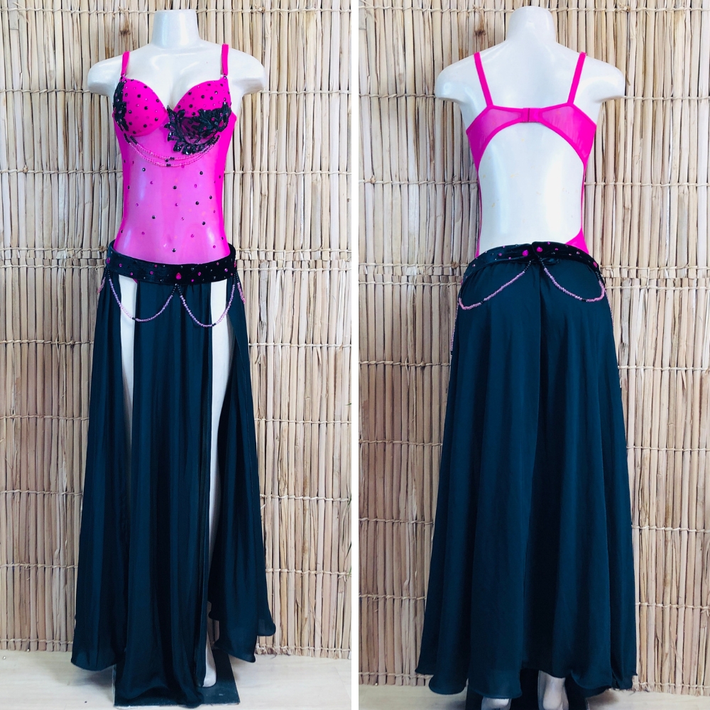 Traje Completo body com bojo, Cinto e Saia, pronto para dançar. Cor dos ítens: body pink e pontos de luz, cinturão preto com chaton e saia preta.