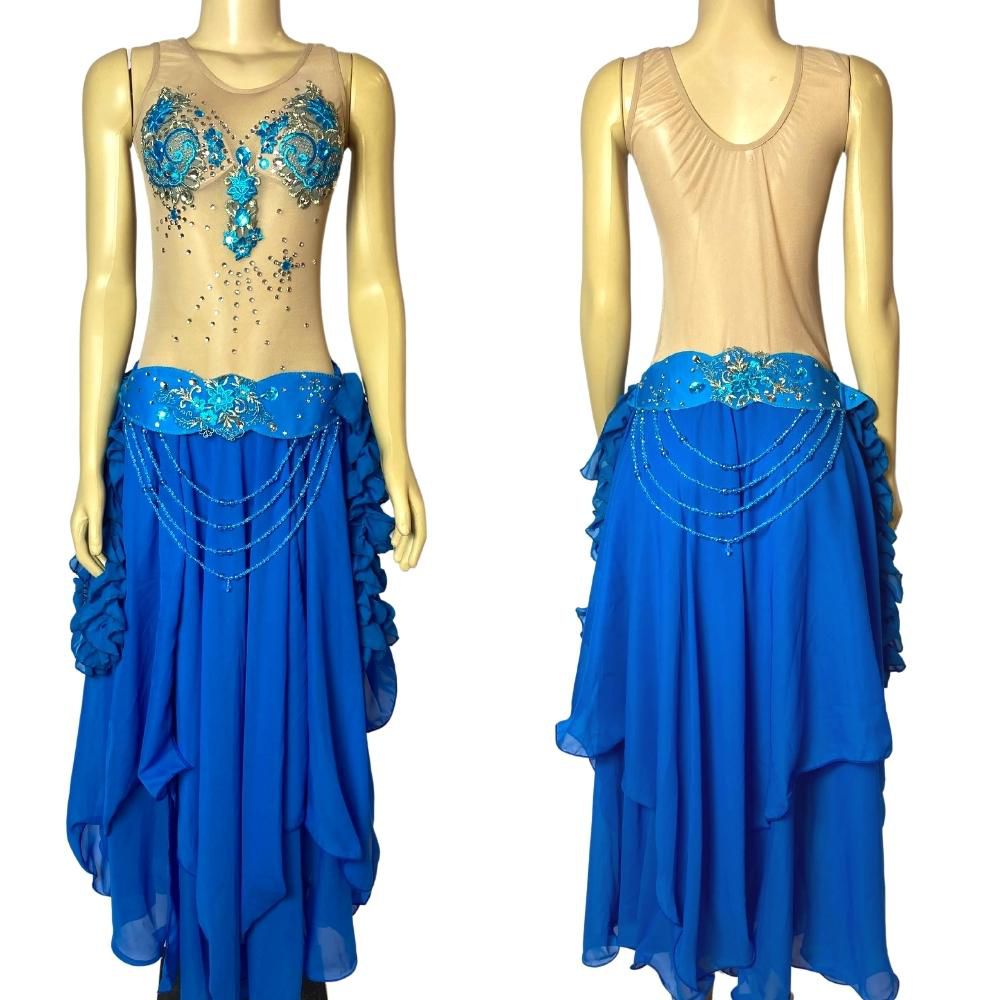 Body com bojo tamanho padrão P 40, Cinturão com 85 cm de ponta à ponta, ajustavel pela amarração lateral para quadris de até 95 cm, Saia godê e bico, duas camadas e duas fendas, nylon na barra, com 100 cm de altura.