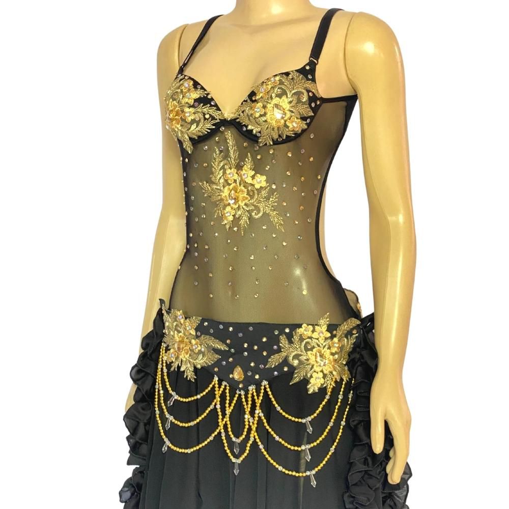Traje Completo Body, Cinto e Saia, pronto para dançar na cor Preto bordado com renda dourada.