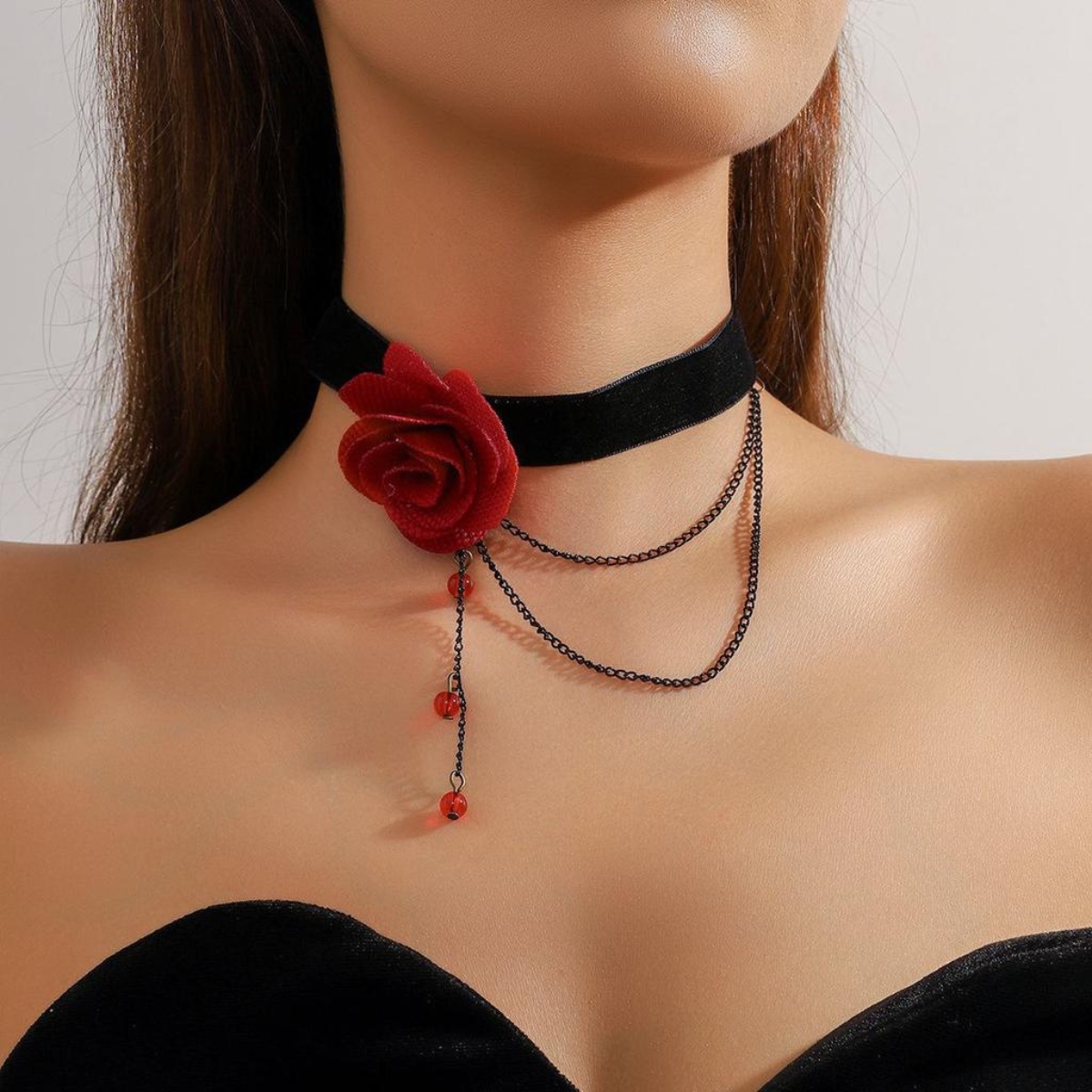 Gargantilha de veludo com rosa vermelha e correntes pretas que trazem charme e movimento. Uma peça marcante, perfeita para looks ousados, dança e produções noturnas. Elegante, leve e cheia de personalidade.