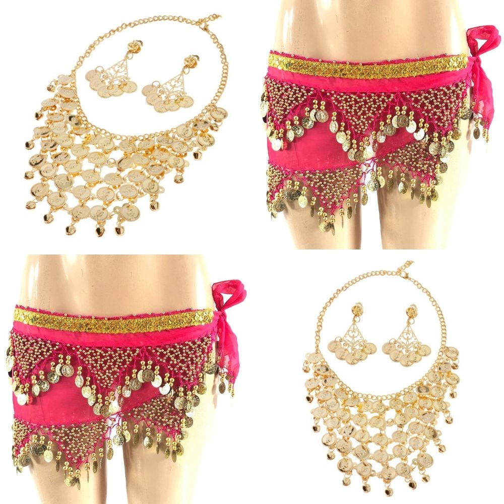 Quantidade no pacote - 1 Colar, 1 par de brincos e 1 Cinto/lenço de quadril - Lenço de Quadril para Dança do Ventre Material: Chiffon + moedas 155 moedas e com bordado de paetês dourados Muito confortável, totalmente ajustável 140cm de uma ponta á outra Ele é perfeito para praticar a dança.