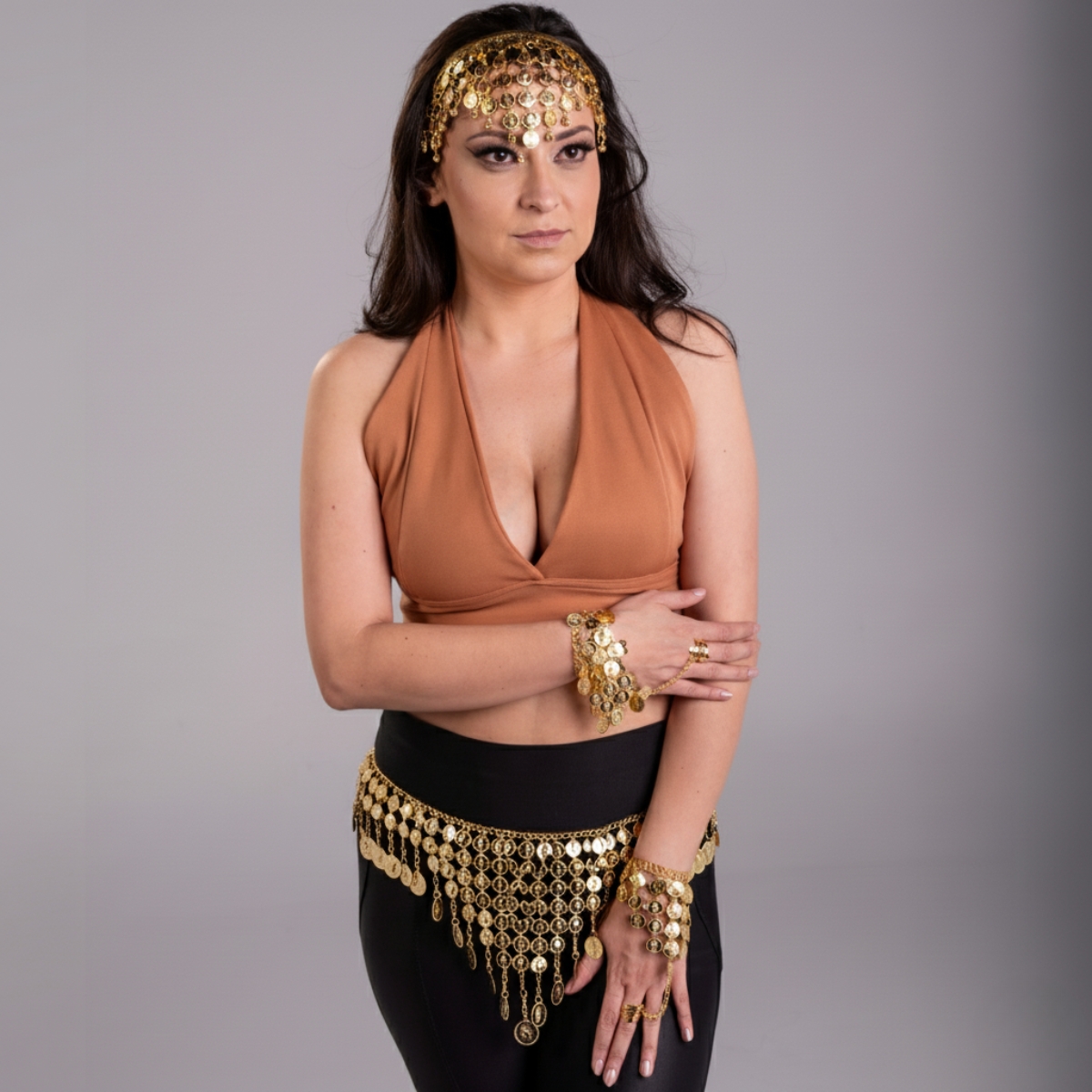 Kit Tiara, Lenço de Quadril E Pulseiras Com Moedas, linda para aulas e apresentações.
