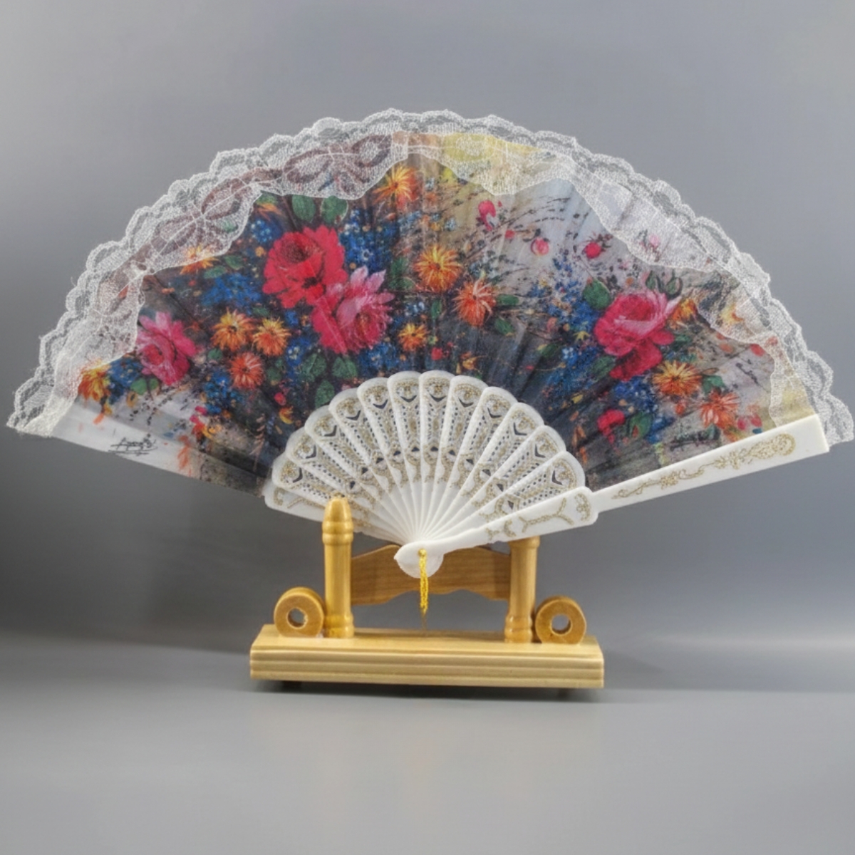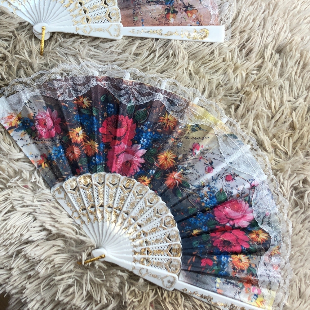 Leque De Mão Tecido Poliester Estampa de Flores de flores com detalhe dourado Com Haste De Plástico Unidade.