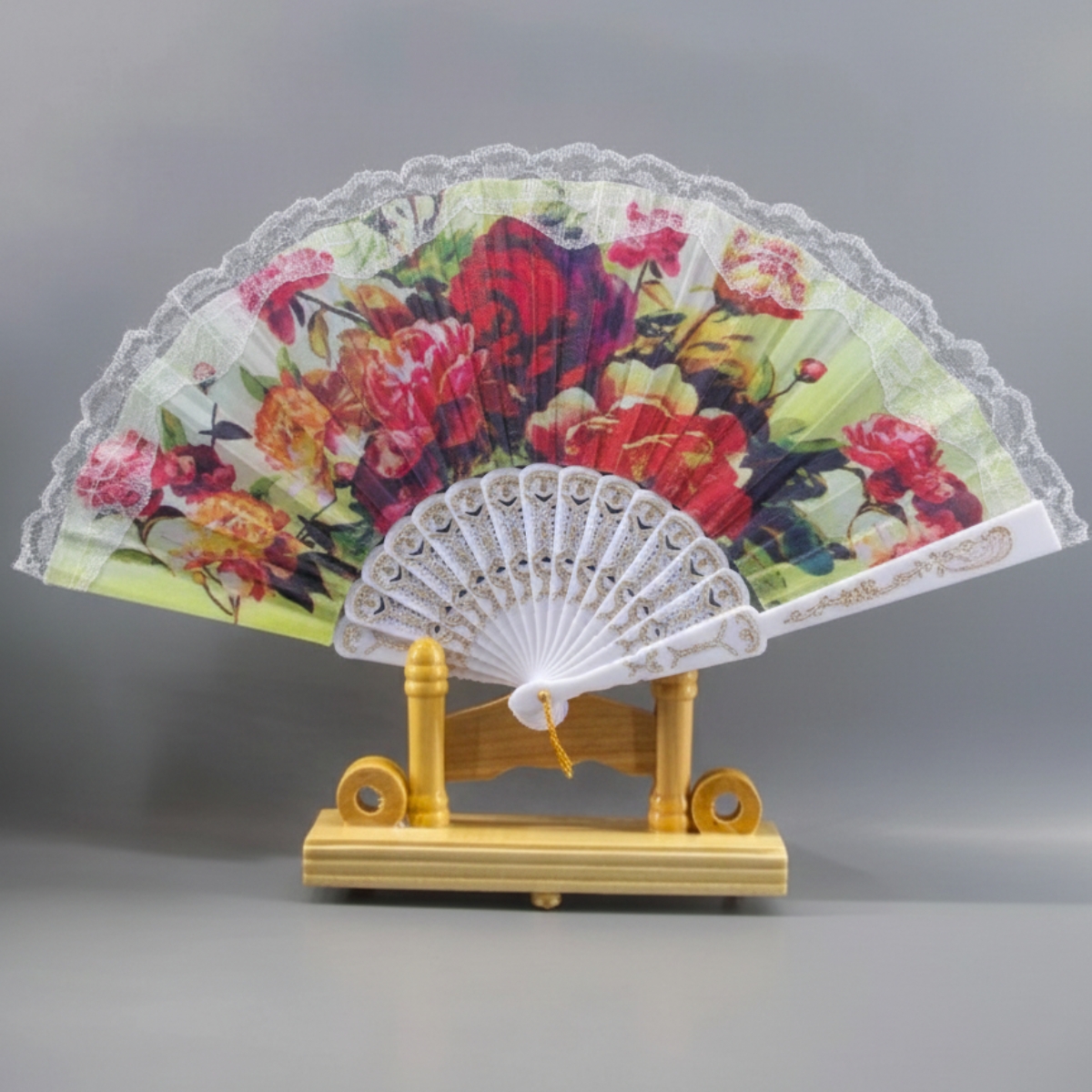 Leque De Mão Tecido Poliester Estampa de Flores de flores com detalhe dourado Com Haste De Plástico Unidade.