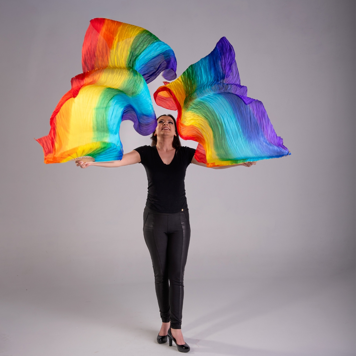 Degrade colorido com as cores do Arco Íris: Roxo, Azul, Verde, Amarelo e Vermelho. - Tamanho 150cm x75cm, leque 30cm em bambu, 100% seda Pongee 5mm. Super leve para efeito lindo e ótimo caimento, seda pura.
