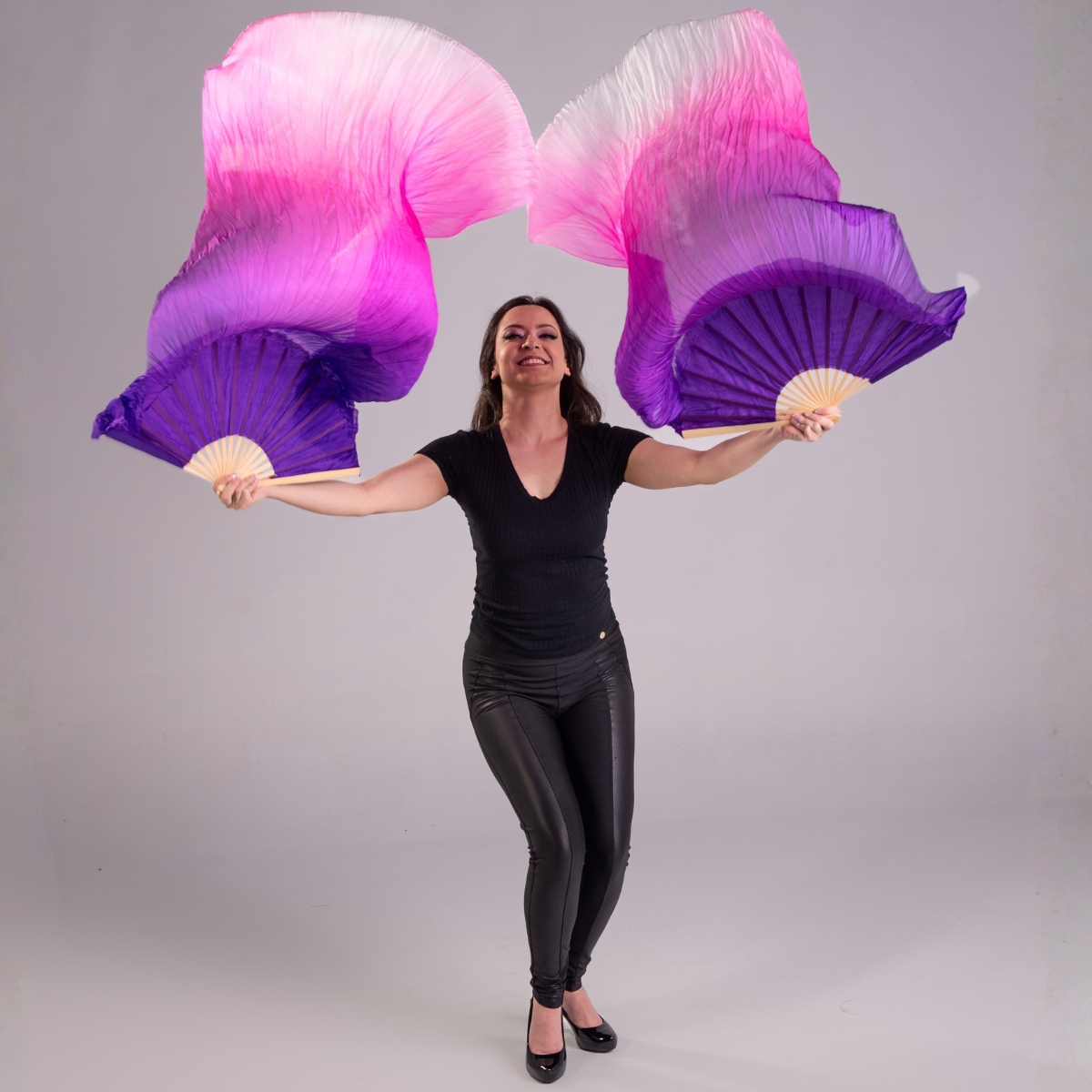 Degrade colorido Roxo, rosa e branco. - Tamanho 180cm x75cm, leque 30cm em bambu, 100% seda Pongee 5mm.