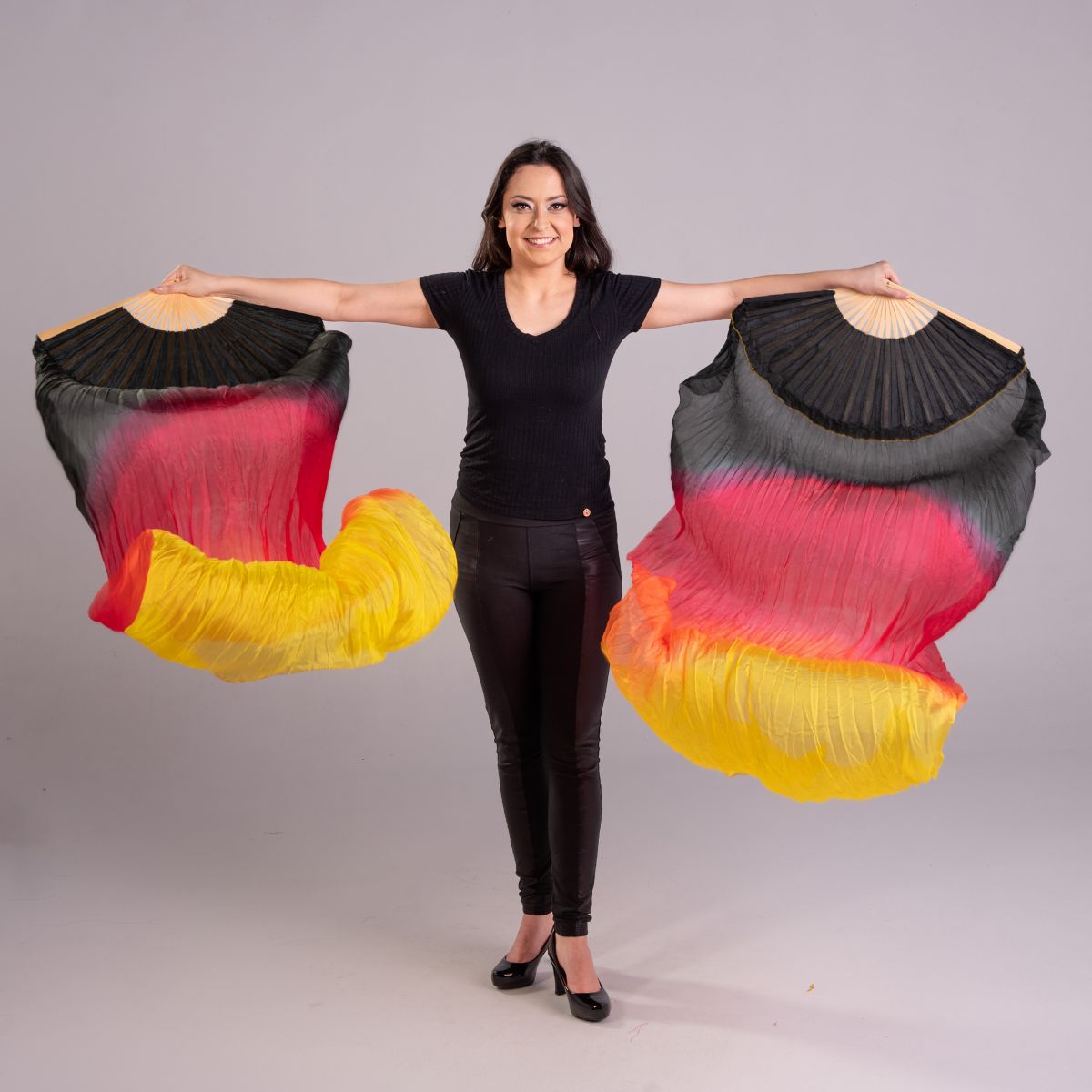 Degrade colorido cores do fogo, preto, vermelho, laranja e amarelo. - Tamanho 150cm x75cm, leque 30cm em bambu, 100% seda Pongee 5mm. Super leve para efeito lindo e ótimo caimento, seda pura.
