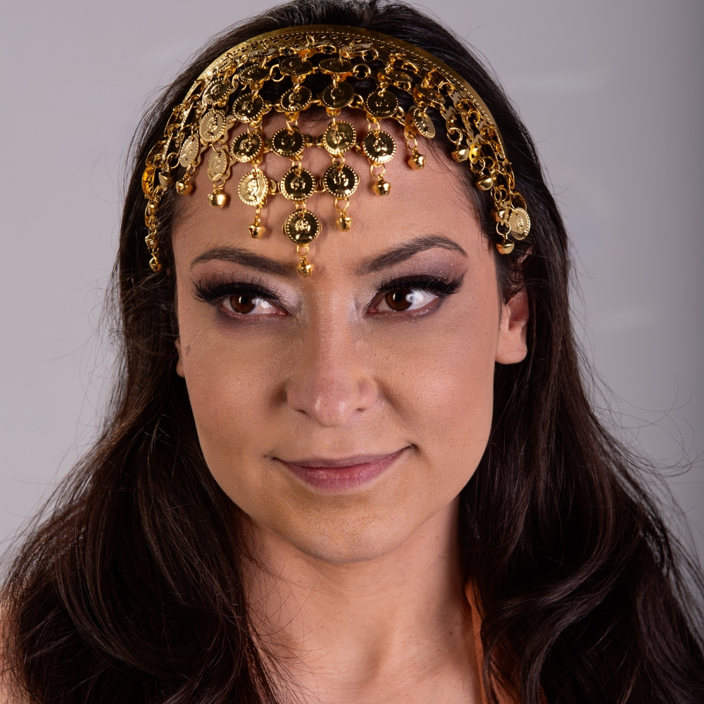 Linda tiara testeira dourada com moedas, linda para aulas e apresentações. Efeito maravilhoso no palco. Ajustável.